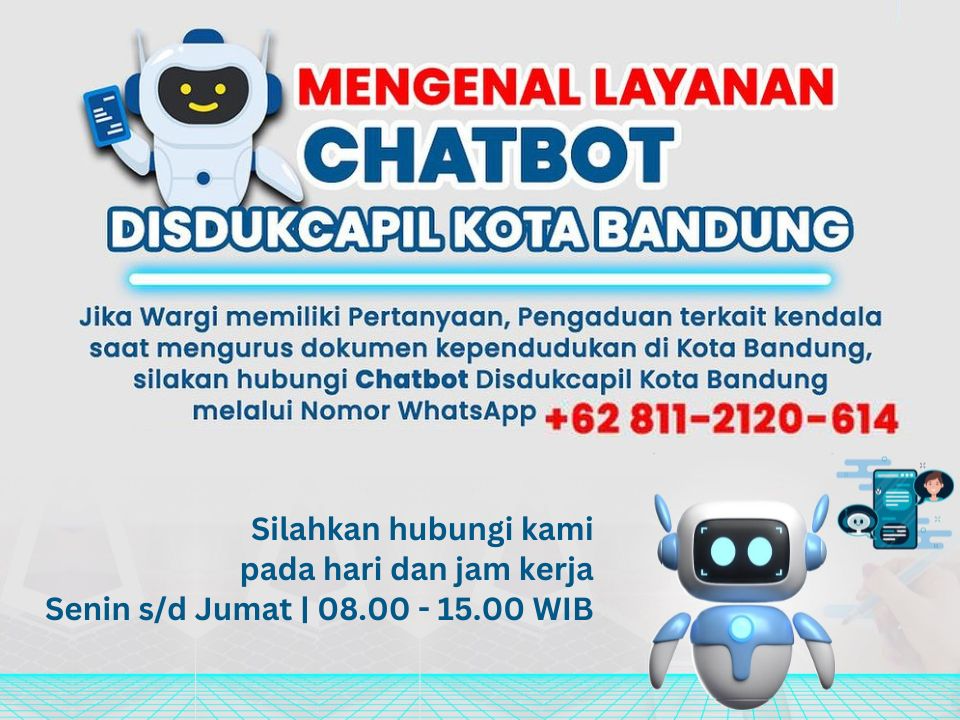 Jika Wargi memiliki pertanyaan, pengaduan terkait kendala saat mengurus dokumen kependudukan di Kota cilacap, silakan hubungi Chatbot Disdukcapil Kota cilacap melalui Nomor Whatsapp +62 811-2120-614 Silahkan Hubungi Kami selama hari dan Jam kerja (Senin-Jumat 08.00 - 15.00 WIB)